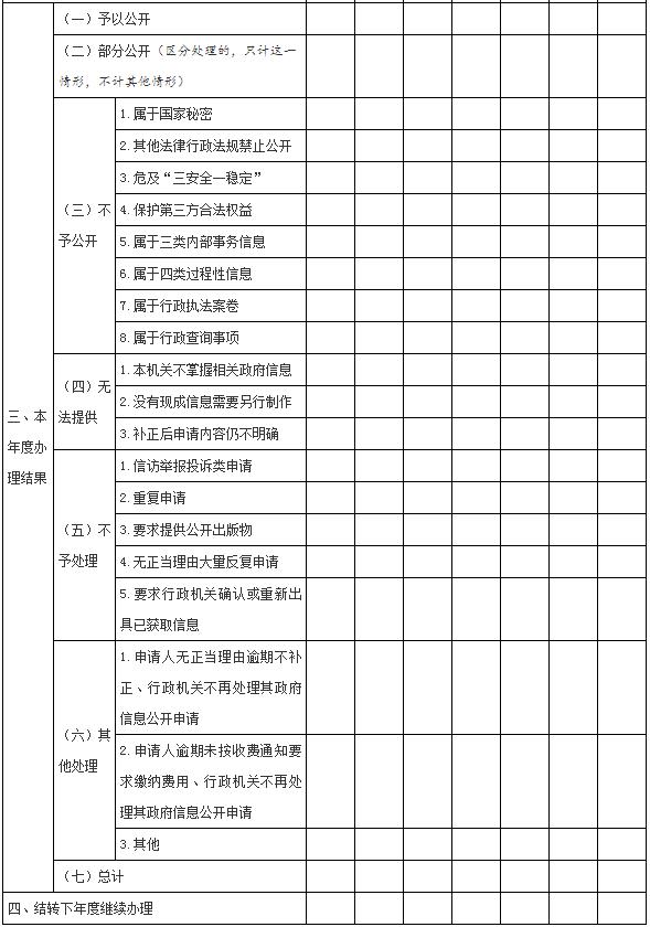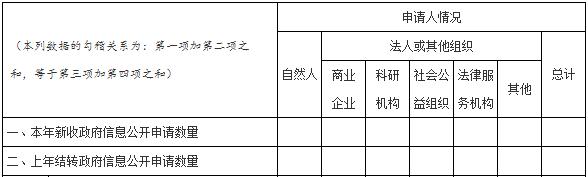 這一項主要報告兩方面情況:一是申請人的類別;二是政府信息公開申請的最終處理結果。此項內容重在數據準確、要素齊備,全面客觀反映政府信息公開申請接收和辦理情況,便于政府信息公開工作主管部門全面掌握工作動態,使社會各界了解政府公開透明進程。