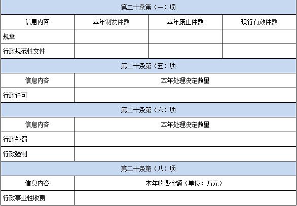 各行政機關年度報告格式模板附后。此前有關政府信息公開的各類報告和統計口徑,隨原政府信息公開條例的失效而失效。政府信息公開工作主管部門負責匯總的本級政府年度報告格式,參照這一格式模板辦理。黨的工作機關加掛行政機關牌子的單位,年度報告內容依據全國政府信息公開工作主管部門發布的有關規定(國辦公開辦函〔2019〕51號)確定,并參照這一格式模板辦理。